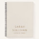 Un cuaderno elegante con tu nombre y texto con una fuente moderna en un fondo de marfil.