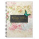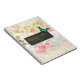 Portátil espiral para planes de boda u otros fines. Diseñado con una mariposa verde y elegante. Un marco negro con un borde dorado sobre un patrón de collage vintage con rosas rosas rosadas densas y hojas de oro verde con un aspecto anticuado y deslucido.