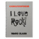 Me encanta el rock, tipografía de la clase de música. Inserte el nombre del estudiante en texto rojo. Fuente genial en negro sobre fondo gris. Las calaveras divertidas están en lugar de las letras o. Personalice con nombre, nombre de la asignatura de la clase escolar, etc.