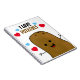 Divertidos y felices papas marrones rodeados de corazones de amor rojos y azules con Amo a las papas con letras negras y marrones encima de su cabeza.