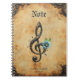 Mechanical clef and flowers to the beat of the clocks. A steampunk-style treble clef, rendered in dark metal with bronze accents and intricate detailing. The clef is adorned with blue flowers that have clock faces at their centers, adding a whimsical touch. Musical notes float near the clef, and small droplets hang from its curves.