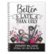 Un portátil divertido y auto-irónico para los amantes del maquillaje, con la leyenda "Mejor tarde que feo", en una tipografía negra moderna, decorada con un hermoso ilustracion de productos cosméticos. Este bloc de notas incluye dos líneas de texto de personalizable, fácilmente personalizables con su nombre y detalles opcionales. Para solicitudes de personalizados, personalizaciones adicionales o combinaciones de colores, por favor no dude en contactarme en zolicestore@hotmail.com