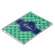 Patrón de entramado marroquí verde esmeralda y blanco con un primer monograma de marina. Encima del patrón de enlistamiento verde y blanco se encuentra una etiqueta azul marino y blanca que incluye una letra monográfica y una plantilla de nombre para el personalizar.