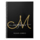 Cuaderno personalizado negro y dorado moderno y elegante con monograma y espiral. Este diseño simple y elegante presenta un nombre en letra cursiva blanca con florituras en blanco y un gran monograma en escritura a mano en color dorado sobre fondo negro. Este cuaderno femenino y bonito es una idea de regalo perfecta para negocios, profesionales, escuela, fiesta de cumpleaños, boda y cualquier fiesta u ocasión para alguien que le gusten los estilos femeninos y modernos. Si necesita ayuda o un artículo que combine, por favor contacte al diseñador.