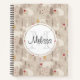 Un cuaderno de espiral personalizado con un bonito patrón de estilo nórdico. Pinos de invierno, osos, renos y ardillas. Color marrón claro. Un círculo blanco se cubrió encima con su nombre y monograma inicial dentro.