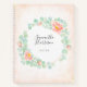 Arte acuático moderno con ramas de eucalipto con follaje rico combinado con peonías rosadas de melocotón que forman una hermosa corona floral. Nombre de personalizable en un elegante borde. Tonos pastel suaves, melocotón, salvia, verde claro, jade, crema, rosa rubor, naranja claro, coral. Las acuarelas resplandecientes caen sobre el fondo. Gran regalo personalizado.