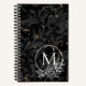 Monograma personalizado en un marco floral blanco sobre un elegante edredón negro y dorado.