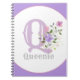 Regalo para alguien con un nombre que comienza con Q. Design incluye el Monograma y Nombre del destinatario con Flores a cada lado en un color pastel de agua. Inicial es la letra Q. Ejemplo es un cuaderno de regalo para Queenie.