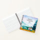 Una hermosa escena de montaña acuarela forma el telón de fondo de un coche verde azulado y un lindo campamento vintage en nuestro portátil atractivo para seguir la pista de sus estancias en el camping, nuevas direcciones de amigos, recetas y más. El texto delante del cuaderno es personalizable y las palabras actuales dicen, "Notas de Camping de Stephanie 2018."