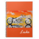Portátil mostrado con una foto impresa de una motocicleta de apariencia nítida y un nombre personalizado. Personalizar este artículo y cambia el nombre al tuyo o quita el nombre y compra como está. Imagen de stock