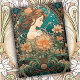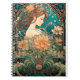 Este cuaderno de Art Nouveau presenta una mujer elegante en la portada, rodeada de un marco ornamentado y hermosas flores suaves.