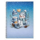 Ilustración invernal encantadora con un muñeco de nieve sonriente, bufanda a rayas, taza azul de cacao, botas y acentos de pino. Paleta azul suave, acentos cálidos y ambiente de temporada acogedora.