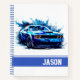 This notebook is shown in a regular shape with college rule pages with a muscle car art print.