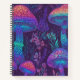A vibrant and intricate design features glowing, mystical fungi rendered in an iridescent neon palette of violet, teal, magenta, and bright blue. The psychedelic mushrooms are surrounded by delicate, ethereal flowers and foliage, creating a truly whimsical and enchanting forest scene.