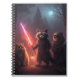 A dramatic, fantastical scene in a misty forest featuring a brave dog, a determined raccoon with a glowing saber, and a cloaked cat with a metallic staff. Bathed in ethereal moonlight and mysterious fog, this unique fantasy art blends science fiction and whimsical animal characters. Perfect for fans of epic adventure, dark forests, and imaginative animal heroes. Adds bold character to wall art, decor, and more.