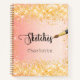 Un fondo de gradiente dorado rosa y naranja. Decorado con finos destellos de purpurina dorado. Personalice y agregue un nombre, El título: cuaderno de bocetos escrito con un estilo de escritura con letras a mano y moderno con chispas y un pincel. Letras de color negro. Un cuaderno para dibujos, bocetos, notas y deberes escolares.