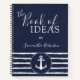 Crea un cuaderno náutico personalizado azul marino y blanco para ideas y planes con el diseño elegante de tipografía, ancla y rayas. Escriba su nombre utilizando la plantilla para crear un regalo único para sus seres queridos. Las franjas tienen un aspecto dibujado a mano.