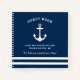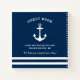 Nautical custom Guest Book spiral bound notebook features a coastal style boat anchor and stripes design. Personalize the custom text with the name of your vacation rental home, the location, and a custom note thanking guests for they stay. Classic navy blue and white color scheme.