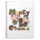 Dos vacas en casquillos de media, regalos del navidad, luces del día de fiesta, bastones de caramelo, y texto rojos que lee el "navidad de Mooey" en las camisetas del día de fiesta, las tazas, las tarjetas, los pegatinas, las bolsas de asas, los relojes de pared, las cajas del recuerdo, los ornamentos, los llaveros, y otra ropa y regalos lindos del día de fiesta del tema de la vaca.