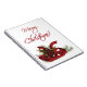 Ilustracion de una pieza central de Navidades hecha de conos de pino y hojas huecas con una cinta roja. También tiene un texto festivo rojo Feliz Navidad en un fondo blanco de nieve limpio.