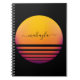 Un cuaderno personalizado con tu nombre y un sol estilizado en tonos naranja y violeta, sobre un fondo negro.