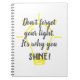 No olvides tu luz. ¡Es por eso que BRILLAS! Difunde tu positividad a un nuevo escritor o estudiante. Este cuaderno es muy edificante, alegre y positivo garantizado para poner una sonrisa en la cara de alguien.