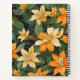 Un patrón vibrante y dinámico de flores naranjas y doradas sobre hojas verdes que destacan sobre un fondo oscuro, creando un contraste cálido y enérgico.