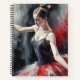 La bailarina resplandece con su traje de gala, combinando la elegancia del negro con bordados plateados delicados y la pasión del rojo con pinceladas plateadas. Un diseño que evoca la magia y la sofisticación de la danza.