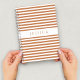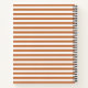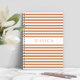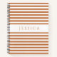 Portátil espiral con una impresión de nombre personalizada en un patrón de rayas blancas y naranja minimalista.