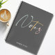 Un cuaderno lindo y elegante. Con un fondo gris oscuro, la palabra Notas está en tipografía de letra cursiva en colores verde claro, gris, amarillo y rosa. Debajo, en tipografía gris claro moderna dice "cosas por hacer".