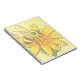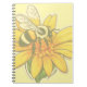 Este cuaderno ha estado recogiendo polen de una gran flor amarilla, la abeja está cortada en forma de dibujos animados y la flor está en dibujos animados.
