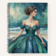 Una princesa con un vestido verdeazulado de lujo se encuentra junto al mar, reflejando la belleza y la serenidad del océano.