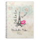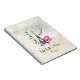 Un cuaderno de espiral personalizado con un bonito fondo de patrón vintage con rosas tenues y otros elementos decorativos. En la parte superior hay un ilustracion de la torre del eiffel y "Ooh La La" escrito a los lados. Una impresión de lápiz labial rosa caliente dejó al lado del famoso monumento con el texto xoxo! Bonjour escrito con un tipo de letra de estilo parisino.