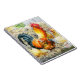 Un gallo de corral enmarcado por un costillar de gallinas y heno en un suave enfoque a su alrededor. Los suaves amarillos y grises ponen el colorido gallo en el centro de la atención, justo donde el orgulloso pájaro gusta estar. Este es un dibujo de un medio mixto en un lápiz de color pastel y aceite. Por Amanda Diehl, Diseños Paxdomino