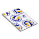 Este lindo cuaderno temático sobre voleibol tiene 5 bolas de voleibol azules, doradas y blancas organizadas al azar con el texto "La cancha de voleibol es mi lugar feliz" en azul rodeando cada voleibol con una divertida fuente tipográfica, todo en un fondo blanco - su nombre y número de camiseta son personalizable - por katz_d_zynes