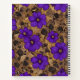 Un patrón de flores violetas que destacan con hojas negras y detalles dorados, creando un diseño lujoso y elegante.