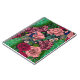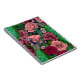 Patrón dibujado a mano con pavos reales y varios rosas sobre un fondo oscuro