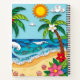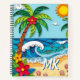 A coastal monogrammed notebook in a paper quilling style ai illustration of two palm trees, the sun, ocean waves, a beach and tropical flowers.