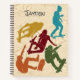 Agregue un nombre u otro texto para crear su propio bloc de notas con temas de skateboarding personalizado. La cubierta frontal contiene cinco ilustraciones de skateboarders de estilo silueta en amarillo mostaza, azul turquesa, rojo oscuro, naranja de óxido y verde sobre un fondo falso de madera. El texto de su personalizado está escrito a mano en gris. La cubierta trasera tiene un patrón de madera coordinado.