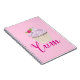 Un cuaderno en espiral con el texto Yum! Diseñado con el ilustracion de un delicioso quequito con remolinos rosas y una baya con hojas enclavadas en la congelación. Se establece sobre un fondo rosa suave.