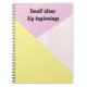 Brighten your day and spark creativity with this pastel-themed spiral notebook! Featuring a soft pink and yellow geometric design, accented with delicate daisies, and a customizable motivational quote: "Small ideas, big beginnings". Personalize the text to make it uniquely yours—whether for journaling, note-taking, or gifting.