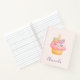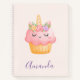Un cuaderno de espiral personalizado con un dibujo acuarela de un quequito con hielo rosa, un cuerno de unicornio y rosas coloridos.