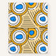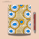 Obra de arte gráfico moderna en fondo terroso con patrón abstracto colorido en azul y amarillo con líneas en negro.