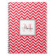 El bloc de notas en espiral personalizado presenta un patrón de chevron rojo con un nombre personalizado en letra de escritura a mano en negro y monograma en tonos rojo pastel con marco cuadrado blanco.