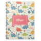 Este cuaderno de juguete personalizado cuenta con dinosaurios coloridos y caprichosos sonriendo en poses divertidas. En el centro del diseño hay una etiqueta con nombre dibujado a mano.