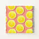 Un patrón de rodajas de limón fresco y jugoso en tonos vivos y vivos de amarillo, con una textura acuarela que le da ese aspecto recién cortado. Están colocadas sobre un fondo color salmón rosa para dar un aire luminoso y veraniego, como una limonada rosa.
