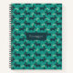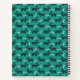 Un cuaderno en espiral diseñado con un patrón de repetición que presenta una linda garganta sonriente con orejas disquetas y un hueso de perro. Fondo verde.