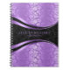 Elegantes damascos florales en color negro y lavanda violeta. Rayas decorativas purpler y negro. Plantilla de bloc de notas giratoria.