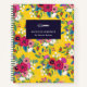 Sorprendente cuaderno de recetas florales con un patrón de flores dibujadas a mano en rosa y morado contra un fondo amarillo brillante. Personaliza tu nombre con letras blancas modernas en una etiqueta azul oscuro bajo un timo de globo.