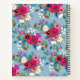Cuaderno de recetas florales con un patrón de flores dibujadas a mano en rosa y morado sobre un fondo azul pálido. Personaliza tu nombre con letras blancas modernas en una etiqueta azul oscuro bajo un timo de globo.